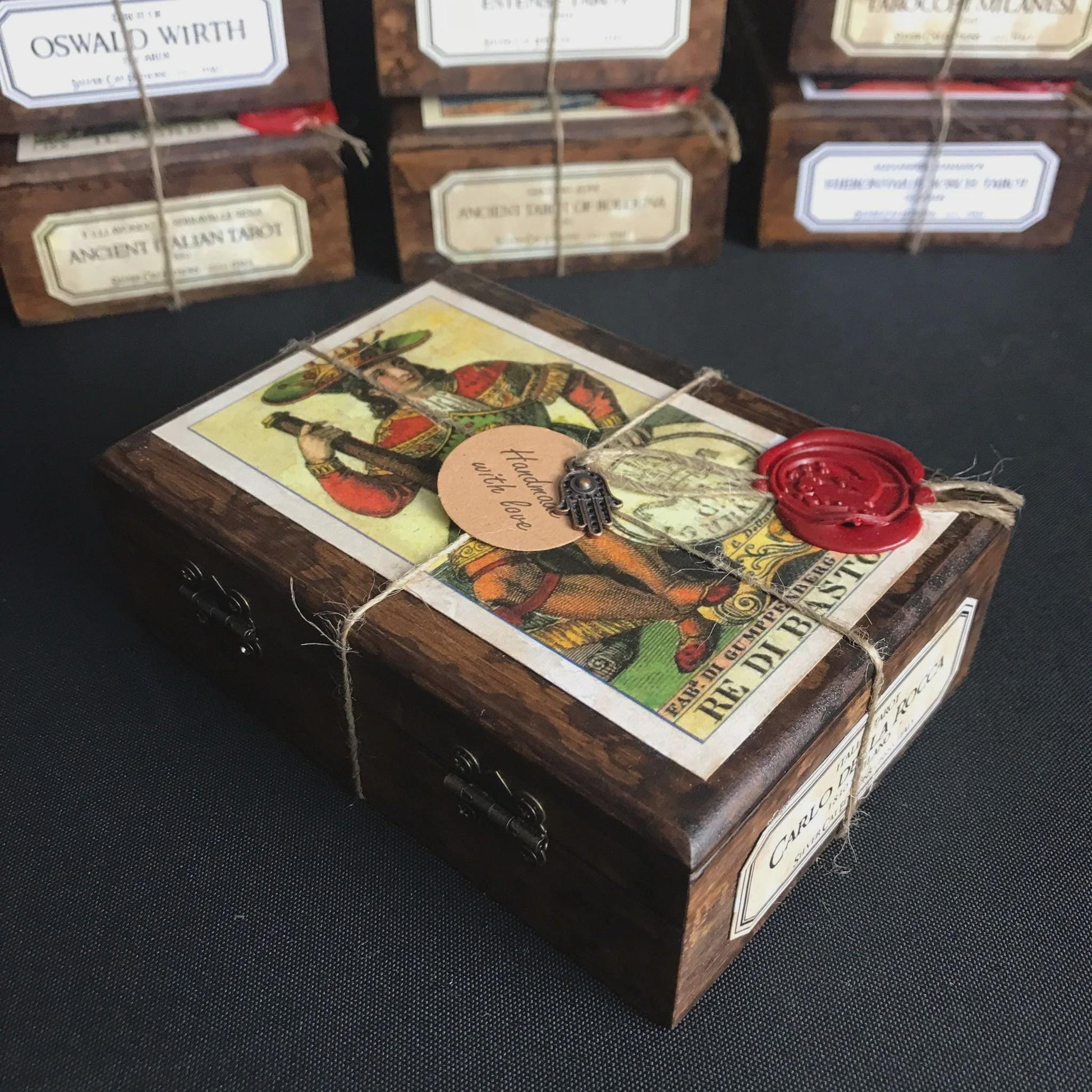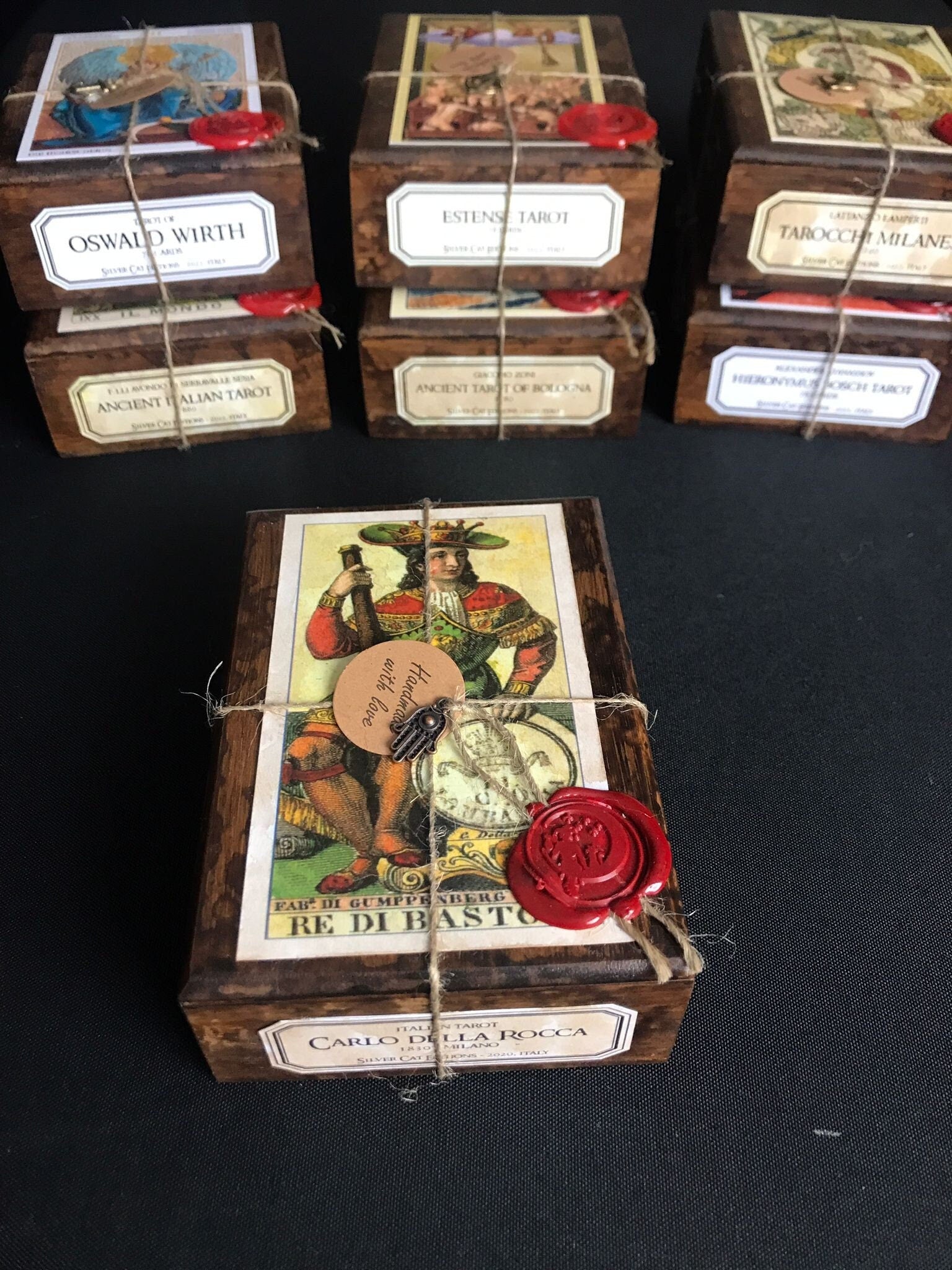 🌟 Discover the magic of our handcrafted tarot decks, a perfect blend of art and mysticism! Each deck is meticulously handcrafted, ensuring every card is a masterpiece of uniqueness and passion. The real magic, however, lies in our exclusive wooden box: hand-painted with special techniques to give a charming vintage effect, this box is not just a container, but a work of art in itself.